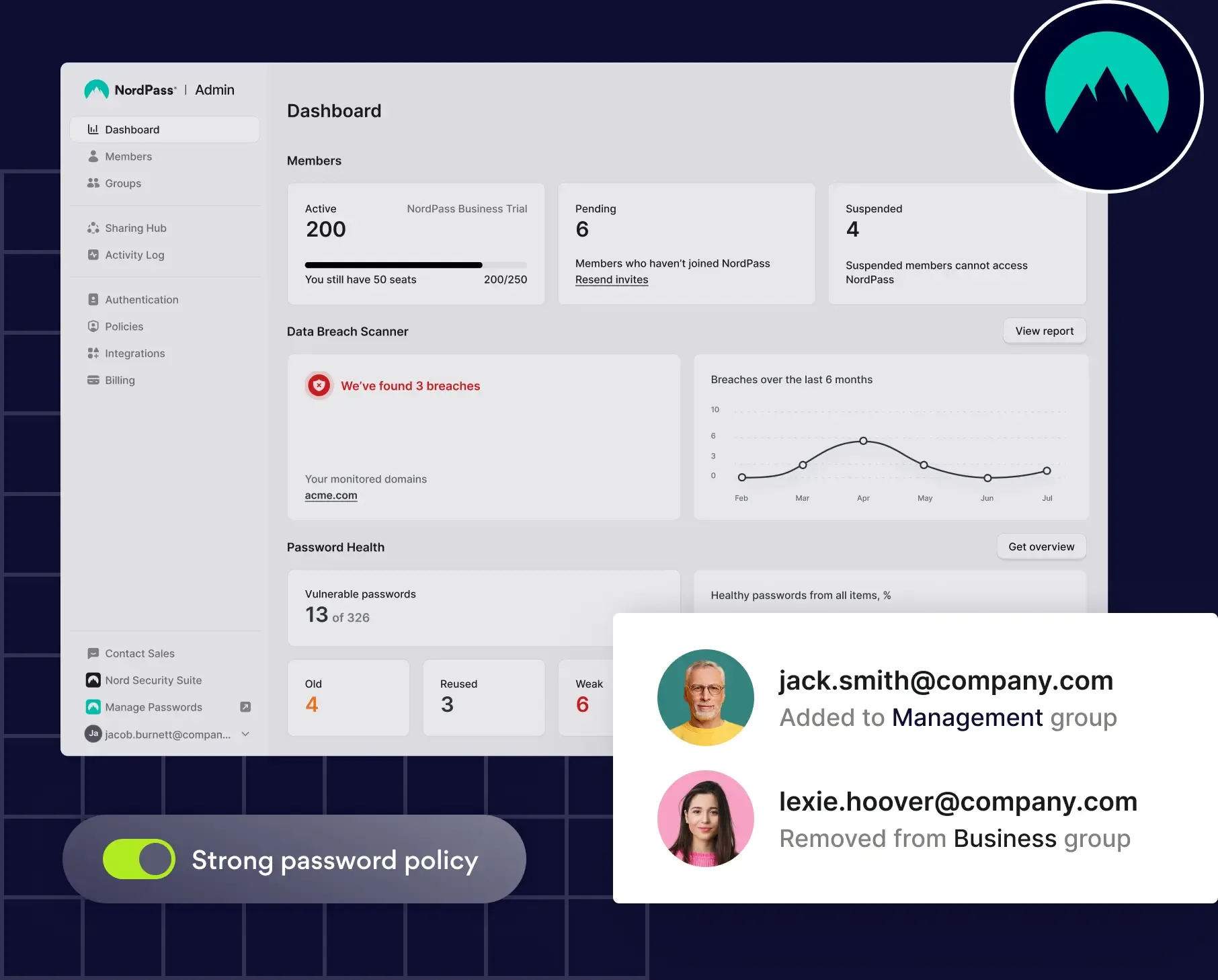 A business password manager like NordPass also helps companies control access to their digital resources with company-wide settings and granular policies, restricting access to authorized users and ensuring that each user has the appropriate permissions. What is more, it identifies weak, old, reused, or compromised passwords across the organization and alerts you if any credentials appear on the dark web.
